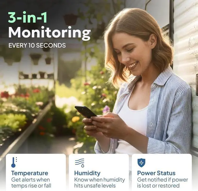 Intuitive Mobile App & Easy Setup - Our user-friendly mobile app gives you remote access to your sensor from anywhere. Use your smartphone or PC to customize alert thresholds, view past readings, and manage device settings with ease. The sensor takes minutes to install and requires no technical expertise. Simply activate the device through the app and plug it into any standard wall outlet.