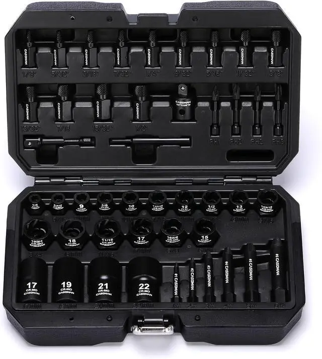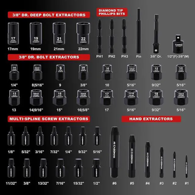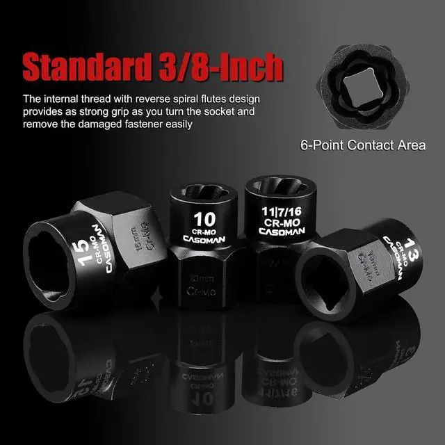 This 3/8" Drive Impact Bolt & Nut Extractor Socket Set is an ultimate solution for removing your damaged, rusted, or stripped fasteners. Its reverse spiral flutes design helps sockets bite for maximum gripping powerthe more you turn, the tighter the socket grips. Made from drop-forged and heat-treated chromium-molybdenum (CR-MO) steel construction, these impact-grade sockets withstand extreme force, while the black phosphate finish resists corrosion for long-lasting durability. Laser-etched markings ensure quick size identification, even in low-light conditionsmaking this set a must-have for professionals and DIYers tackling tough jobs.