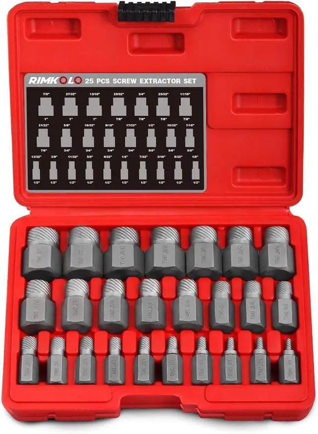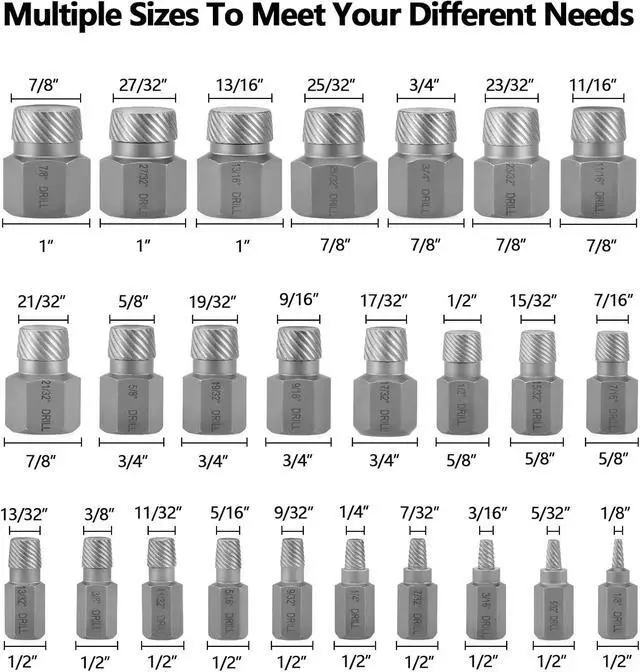 25-PIECE BOLT EXTRACTOR: The broken screw remover comes with a heavy-duty carrying case, lets all the multi-spline screw extractors stay organized. It contains 7/8", 27/32", 13/16", 25/32", 3/4", 23/32", 11/16", 21/32", 5/8", 19/32", 9/16", 17/32", 1/2", 15/32", 7/16", 13/32", 3/8", 11/32", 5/16", 9/32", 1/4", 7/32", 3/16", 5/32", 1/8", meets all your needs.