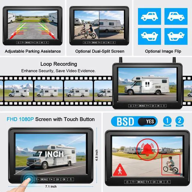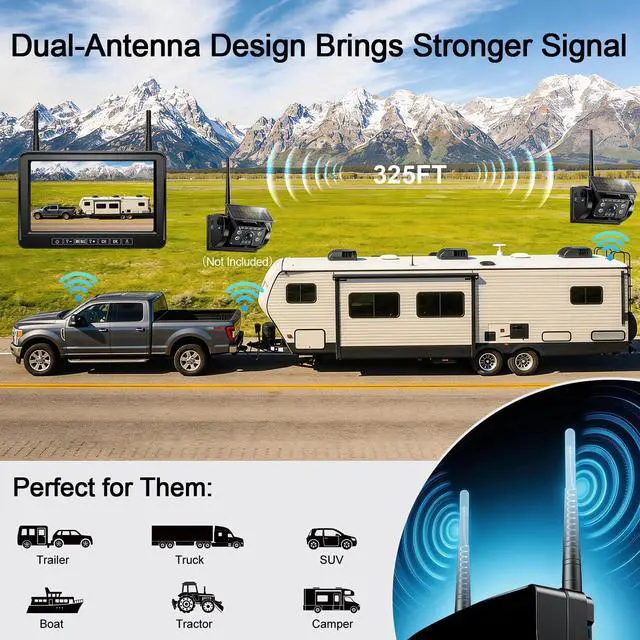 Stable Wireless Signal: Experience a sharp, stable view with our 1080P full HD camera and zero-latency transmission technology. Paired with a 7-inch IPS screen and dual-antenna design, it delivers smooth, real-time footage with enhanced signal stability. Supports 2 camera channels for a dual-split screen display to minimize blind spots.