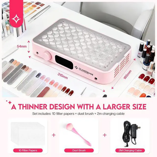 COMPACT DESIGN WITH EXTRA-LONG POWER CORD: The slim body (315×185×54mm) fits perfectly on manicure tables without taking up extra workspace. The 2-meter extra-long power cord allows flexible placement anywhere on your nail desk, while the bottom heat-dissipation system prevents overheating during long nail sessions. Ideal for salons, home nail studios, and mobile nail techs.