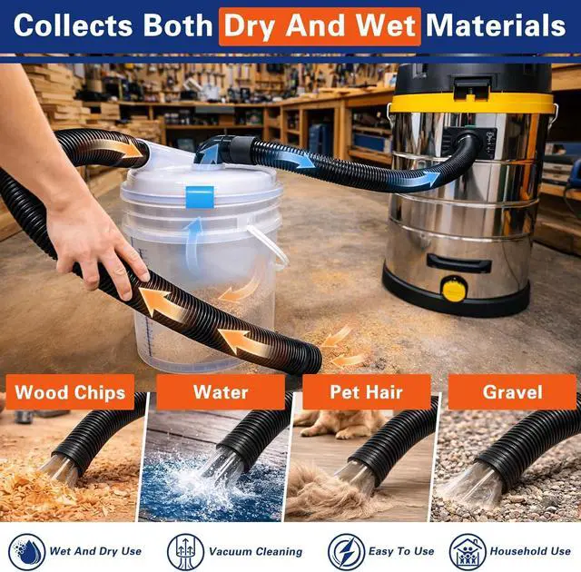 Complete Dust Collection Kit -Made from durable, high-quality materials, this kit includes everything needed for quick setup: 1 low-profile dust separator, 2 × 90-degree elbows, 2 × connectors, and 1 × 2-1/2-inch hose. It's compatible with most wet/dry vacuums and can handle a wide range of debris types, from wood dust and drywall to wet materials and pet hair.