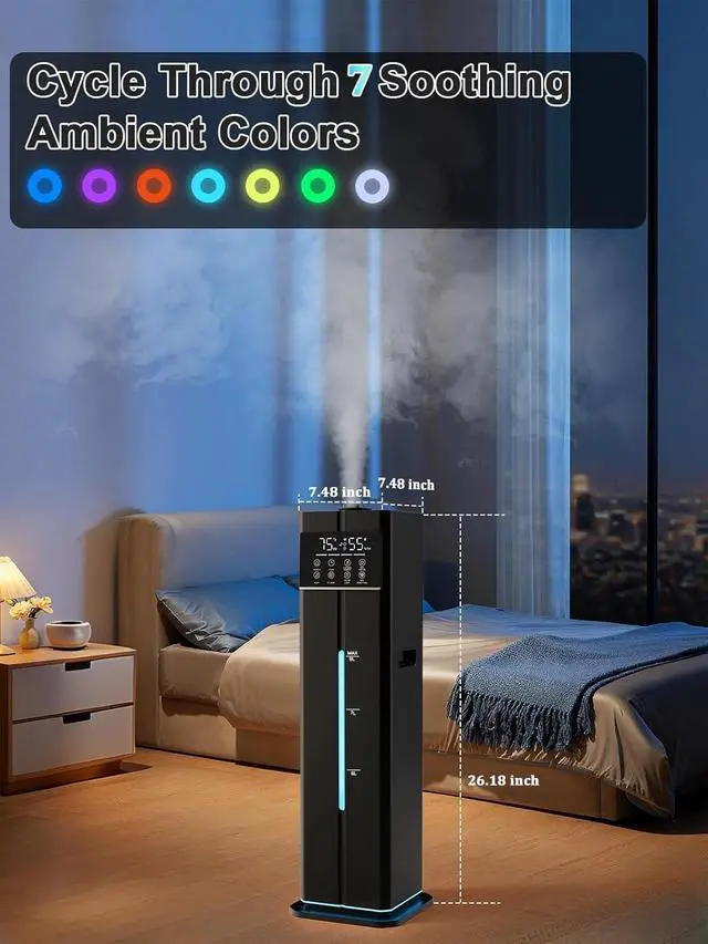 Quiet Sleep Mode & Soothing 7-Color LightEnhance your home experience with this humidifiers tranquil sleep mode, operating at a quiet 35dB for undisturbed rest. The built-in 7-color night light features a gentle, automatic cycle, creating a calming and relaxing ambiance for your room