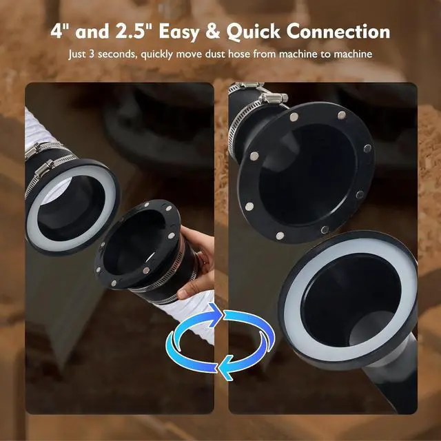 Upgraded Tool-Free Fastening Design: Say goodbye to screwdrivers. Our upgraded manual-knob fastening mechanism enables rapid installation and removal without tools. For professional users who frequently switch their dust collection hose between machines, this design eliminates tool dependency, prevents lost screws, and ensures easy operation even in dusty, grimy workshop conditions.