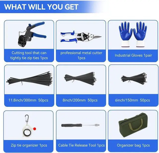 50pcs 11.8 inch/300mm black metal zip ties +50pcs 8 inch/200mm black metal zip ties+50pcs 6 inch/150mm black metal zip ties: Metal cable tie has a longer lifespan and is harder than plastic cable ties. We have multiple specifications available for you to use and purchase. And other auxiliary tools