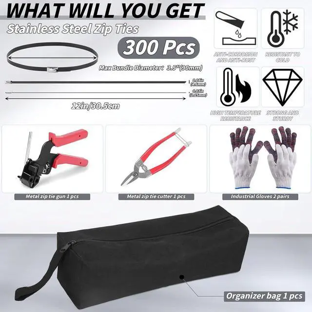 Self-Locking Stainless Steel Zip Ties: This stainless steel cable tie features a self-locking mechanism and adjustable tension, ensuring a secure and tight fixation each time. The accompanying tools for the metal twist ties can perform smooth and seamless cutting without any burrs, eliminating the risk of snagging or scratching, and providing comprehensive protection for your cables and hands