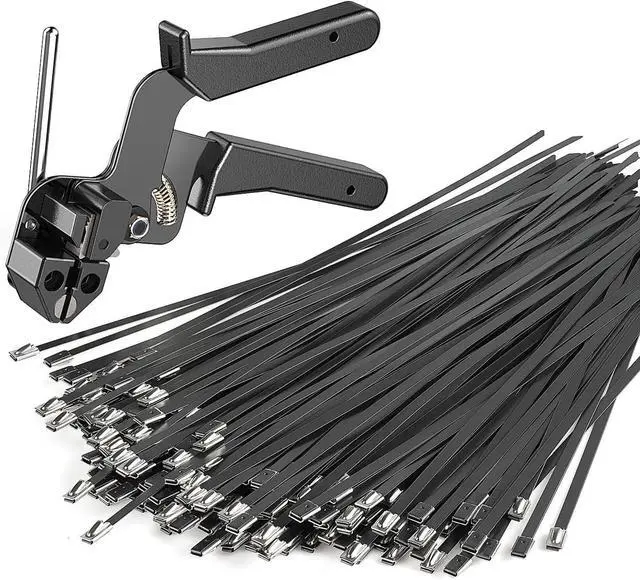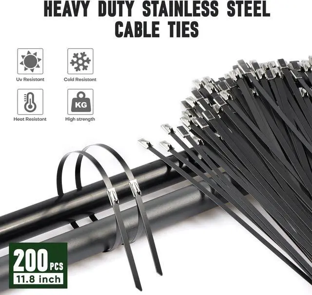[INCLUDES EVERYTHING YOU NEED - READY TO WORK OUT OF THE BOX] Complete Kit: 1x Professional Cable Tie Gun (Made of High - strength Steel and Rubber Grip Material)+ 200x Black Metal Ties ( 11.8 inch, 300mm). Everything you need included. Compatible with all standard stainless steel ties (up to 12mm wide) if you need to buy more later. 200LB tensile strength rated ties - strong enough for heavy cargo wrapping, utility poles, and outdoor machinery.