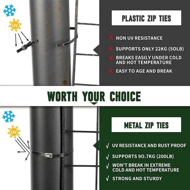 [UV-RESISTANT & MAINTENANCE-FREE - SET IT & FORGET IT FOR YEARS] 304 stainless steel + black epoxy coating creates an impenetrable barrier against rust, salt spray (coastal), and extreme temperature swings (-20°F to +180°F). No tightening needed, no degradation from UV rays. Tested in harsh outdoor environments for 5+ years without failure. Perfect for permanent installations where you can't access the ties later.