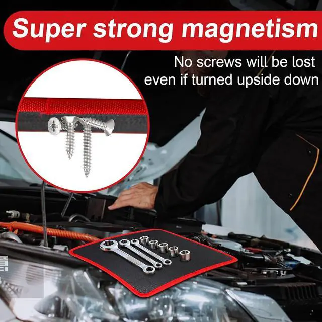 This three-piece magnetic tool mat set helps organize metal tools and parts in your garage, workshop, or automotive repair space. Simply place it on any steel surfacetools will securely attach while you work. Each mat features built-in powerful magnets that firmly adhere to tool cabinets, workbenches, hoods, and even vertical or overhead surfaces. Wrenches, pliers, screws, bolts, and nuts stay securely in place during use. The durable PVC leather surface resists oil and dust, wiping clean effortlesslyunlike fabric mats that absorb liquids or retain odors. Three sizes combine to meet diverse storage needs: Small ( 4.7 x 4.7 )Ideal for screws and micro-parts Medium ( 12.8 × 4) Ideal for storing wrenches and pliers Large ( 12.8 × 9.8 ) Holds multiple tools simultaneously Ideal for auto technicians, mechanics, carpenters, plumbers, and DIY enthusiasts.