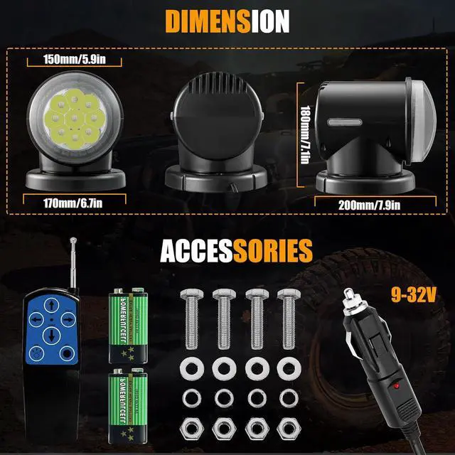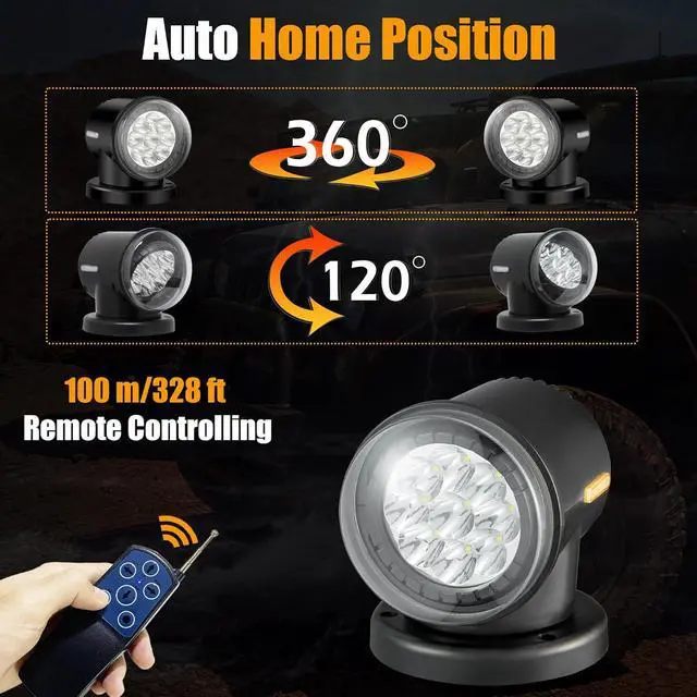 Versatile LightingThis LED remote control search light features 360° horizontally and 120° vertically rotation, and automatically returns to home position when switched off, perfecting for 12V 24V trucks, boats, and go outdoor