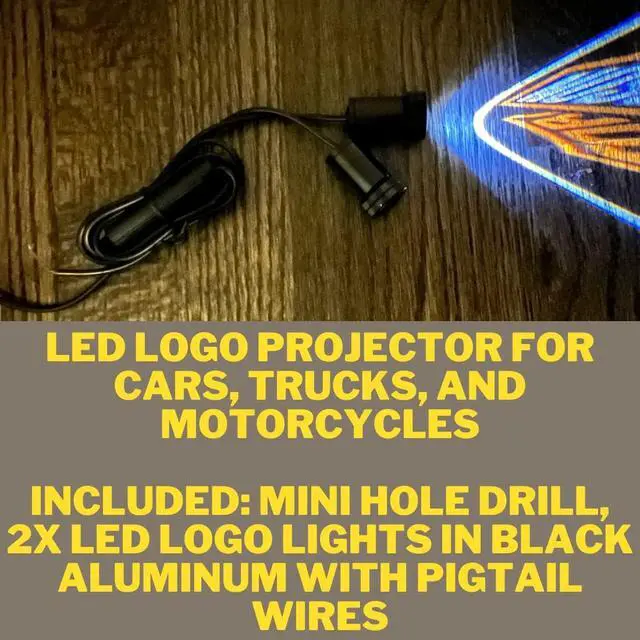 INCLUDED: mini hole drill, 2x LED logo lights in black aluminum with pigtail wires