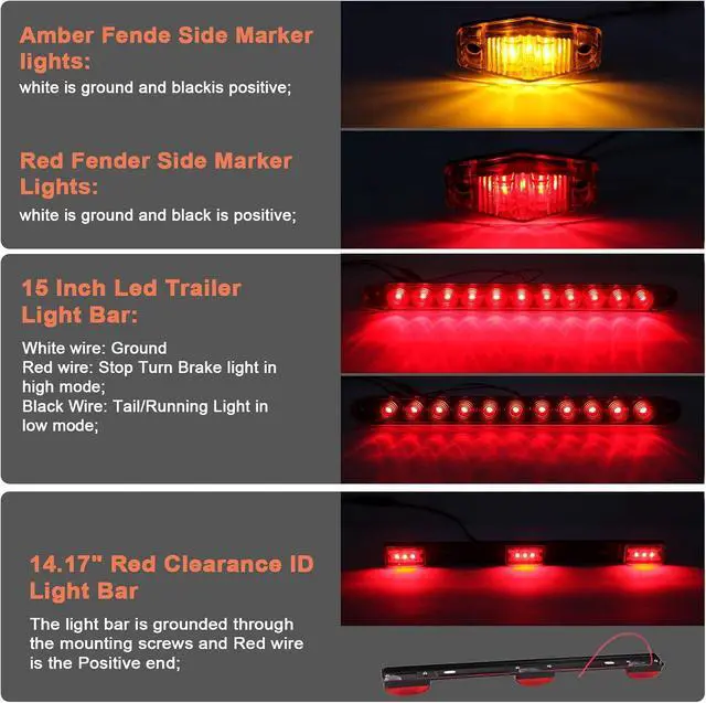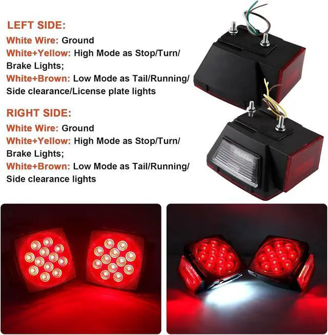 Wiring Tips: white wire is ground, yellow wire is high brightness for brake Light and brown is low brightness as Running Light/Left License Plate illuminator (Square tail Lights); white is ground, red is high Brightness for brake/stop/turn light, black is low brightness as running Light(15" led trailer tail light bar); white is ground and black is positive (mini side marker lights);