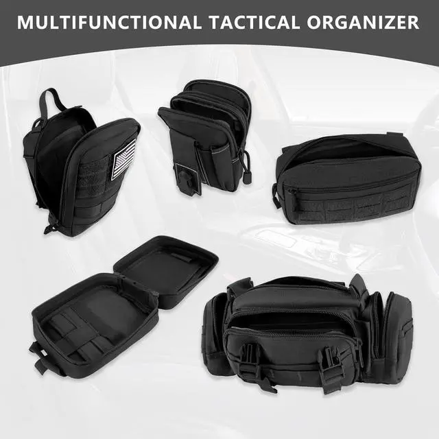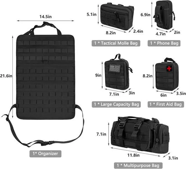 What You Get1*Tactical Seat Back Organizer, 1*Tactical Medical Pouch, 1*Molle Admin Pouch, 1*Large Item Storage Pouch, 1*Tactical Waist Bag, 1* Phone Pouch. Suitable for storing mobile phones, tactical pens, Keychains, GPS devices, digital cameras, medical supplies or any necessary small tools you need, perfect for your outdoor activities.