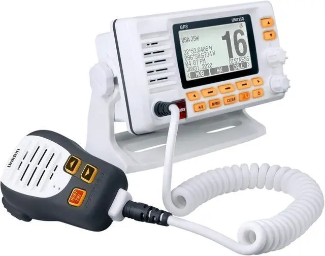 UM725G Marine VHF Radio, all USA, Canada, and Intl. Marine Channels, 1Watt/25Watt Transmit Power, Largest LCD Screen in class, NOAA Weather Channels w/ Alerts, Speaker Mic, GPS Built-in.