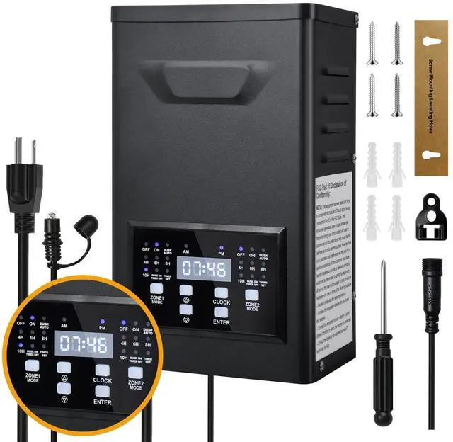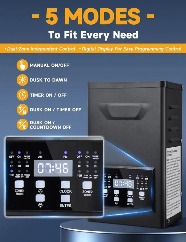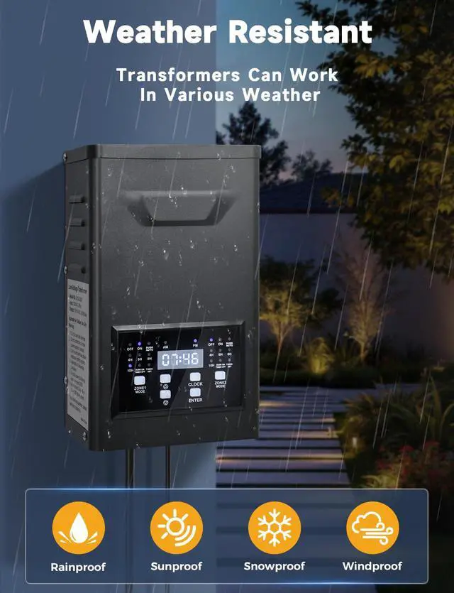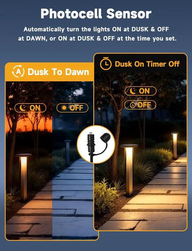 5 Modes to Fit Every Need - This landscape transformer features five control modes: Manual On/Off, Auto On/Off (dusk to dawn), Countdown (on at dusk and off 4/6/8/10 hrs later), Timer (on/off at the time you set), and Photocell On / Timer Off (on at dusk, off at your preset time). These flexible options are designed to suit different outdoor lighting scenarios while maximizing energy efficiency and convenience.