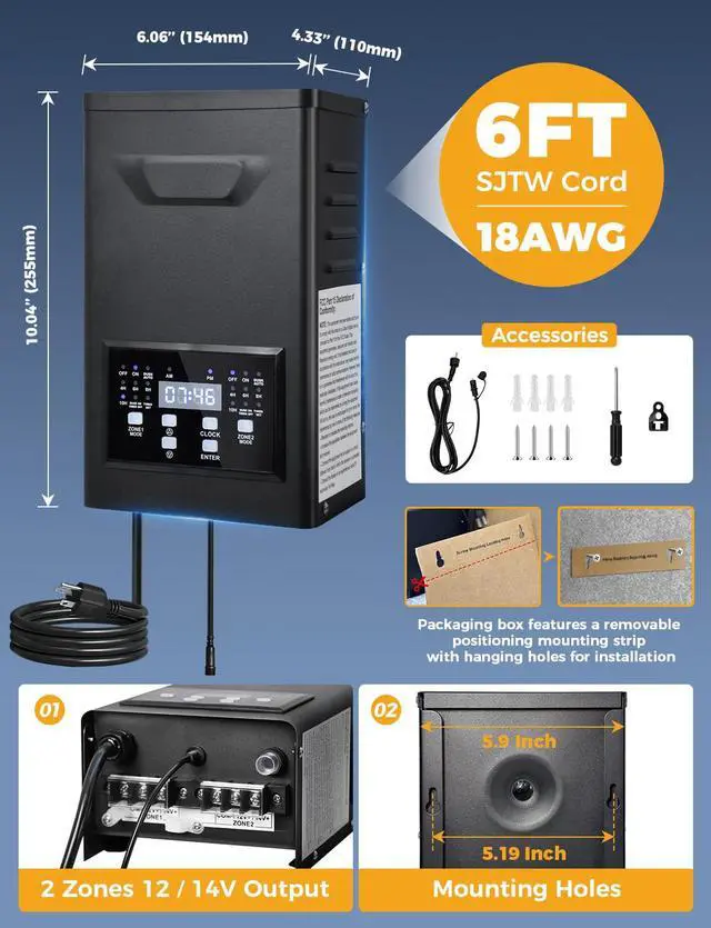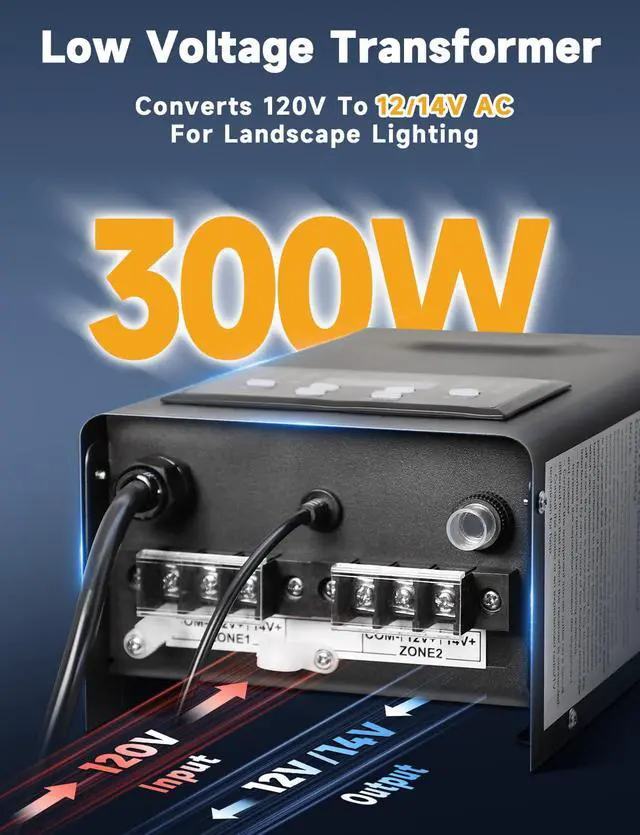 Dual-Zone Independent Control - This 300W outdoor lighting transformer allows you to choose different operating modes and timer settings for two output zones (ZONE 1 and ZONE 2). Each zone operatesseparately without interfering with the other. You can set the mode easily for each zone by pressing the "ZONE 1 MODE" or "ZONE 2 MODE" button. The total output of each current (Zone1 or Zone2) cannotexceed 65% of the total power of the transformer.