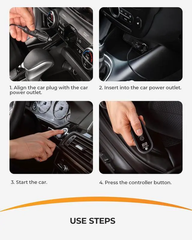• Warm Tips: For proper operation, ensure the car plug is fully inserted into the vehicles power outlet. Push firmly until secure, as a loose connection may cause incompatible or not heat properly.