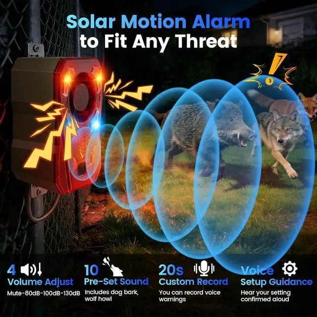 130dB Loud Noise & Custom RecordingEquipped with a 130dB loud alarm (including dog barking, gunshots, and 10 other sound options) plus bright flashing lights to strongly warn off intruders. It also supports 20-second custom voice recording for personalized warnings. With 4 volume control(Mute-80dB-100dB-130dB), you can avoid disturbing neighbors or creating excess noise at nightanother key advantage over basic motion detector alarms.