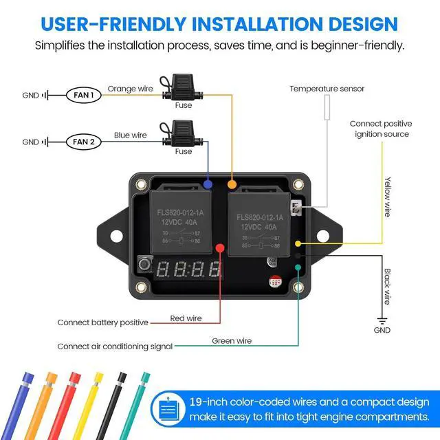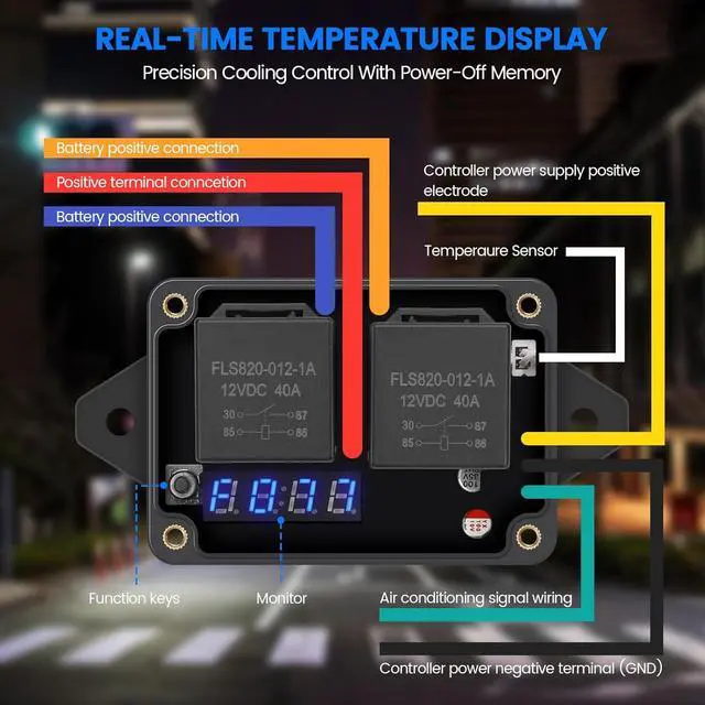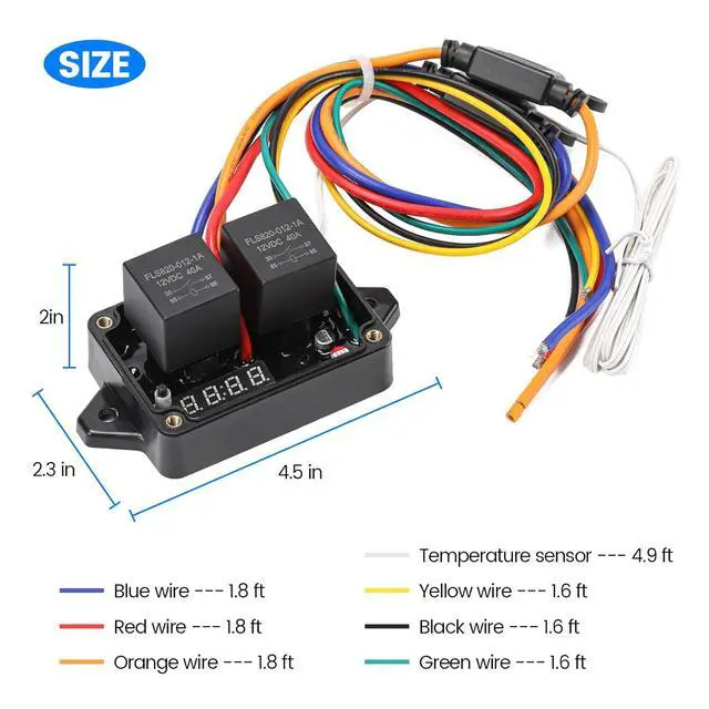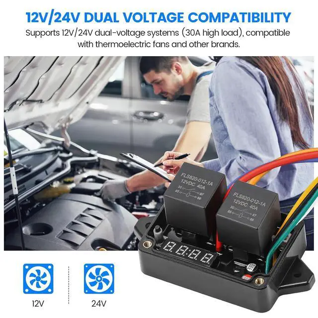 COMPATIBILITY: This radiator fan controller supports dual-voltage systems (30A load), working with thermal fans and other brands. Ideal for automotive cooling systems, industrial equipment, AC, and cooling applications