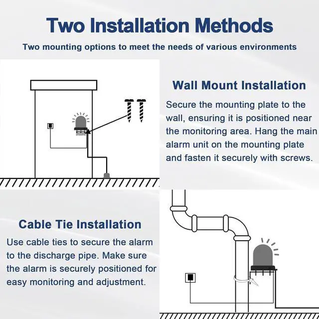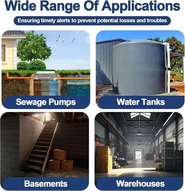 Wide Application: Perfect for monitoring water levels in sump pumps, water tanks, lift stations, and low-density oil and sewage. Its reliable high water leak detection alarm system and easy installation design ensure efficient operation in both indoor and outdoor environments.