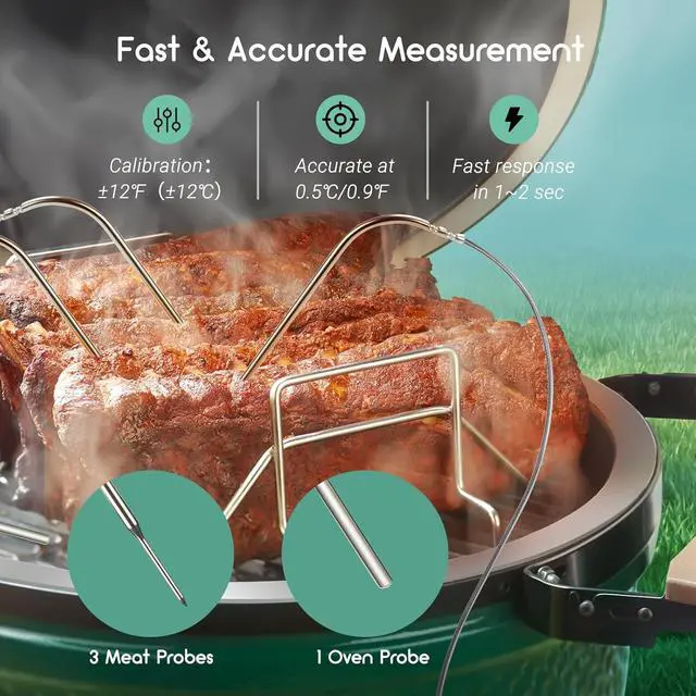 High Accuracy & CalibrationFour food-grade stainless steel probes all feature high measurement accuracy of ± 0.9 and support ±12 temperature calibration. Each probe supports a short-time measurement range from 32572 (0 to 300) and a continuous monitoring range from 32482 (0 to 250). We can set temperature alarms and timers to avoid overcooking and undercooking.