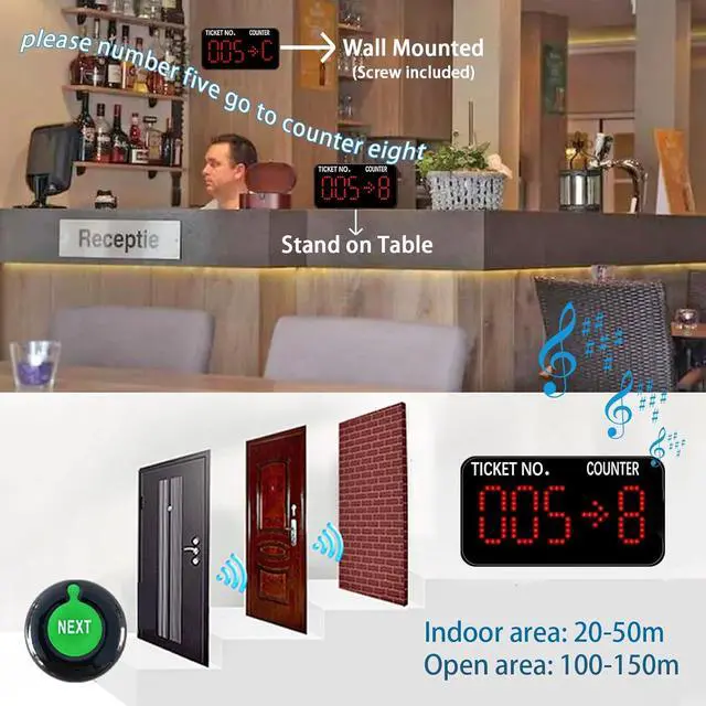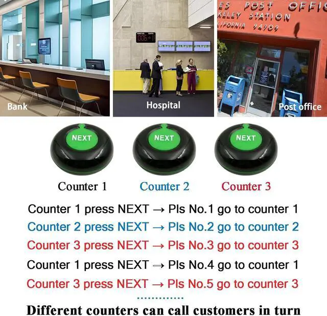NEXT Button: It is a waterproof signal transmitter for the service personnel. When the "NEXT" button is pressed, the number will automatically go to the next one, accompanied by an indicator light prompt. It makes our queue wireless calling system simple and easy to use.