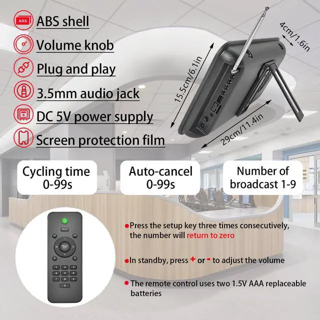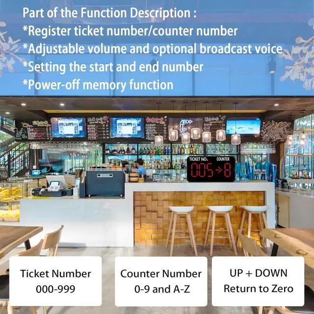 The receiver consists of 3-digit ticket number and 1-digit counter number. The number display can be mounted on a wall or desktop. Easily adjust the volume, voice mode, number of broadcasts, cycle time, etc. The default voice mode is "Dingdong + Number XXX go to X"