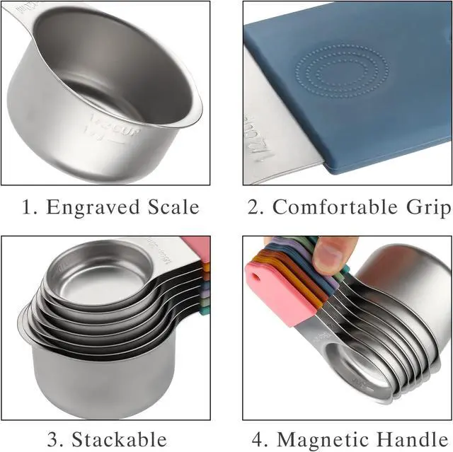 Magnetic Cup HandleThe cup handle is nested in silicone, which is comfortable in the hand and does not slip or cut your hands. It also contains magnets. There is a strong magnetic attraction between the cup handle and the cup handle. The design of the oval concave and convex part on the silicone handle conforms to normal holding habits. The colorful handles make the whole set of measuring tools look cute and good-looking, and they are easy to identify.