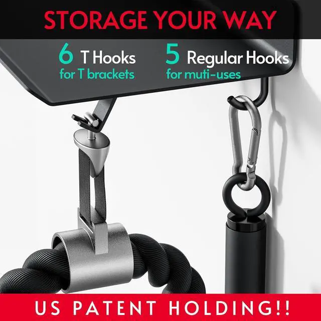 Higher Capacity: Features 6 brackets for T-shape lock accessories and 5 additional hooks; metal shelf organizer provides more storage space than standard gym racks with only four mounts; wall shelf great for organizing your fitness equipment