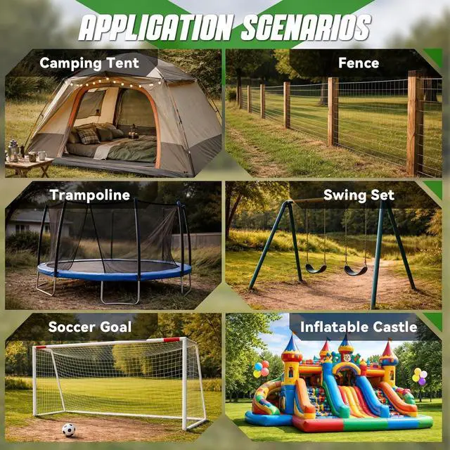 Versatile Applications: Designed for a wide range of outdoor structures including storage sheds, trampolines, swing sets, mobile homes, fences, tents, canopies, carports, gazebos, and play equipment.