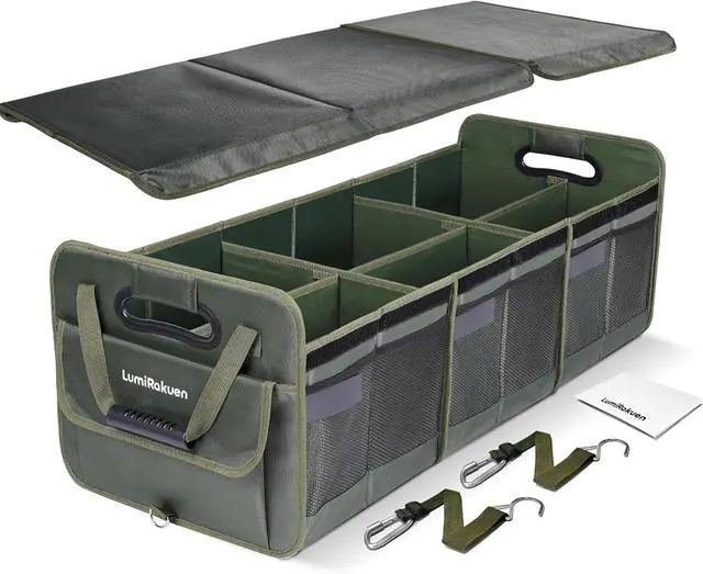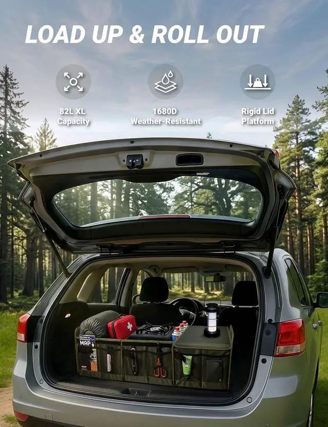3-IN-1 MODULAR DESIGN: FROM SUV TO SEDAN Fully expanded ( 35.4"L ), its 3 fixed compartments swallow massive loads like camping gear; fold down to 2 sections for compact sedan trunks or 1 section for the passenger seat. The collapsible design maximizes storage with a Large Front Pocket and 6 Mesh Side Pockets. We use high-grade Fastening Strips for a gap-free, space-saving fold when not in use.