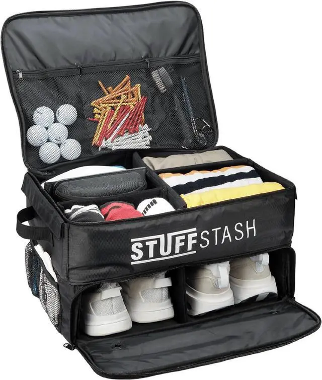 VENTILATED SHOE COMPARTMENT KEEPS GEAR FRESH; Built-in air vents in the golf shoe bag compartment allow circulation to keep footwear dry and odor-free. A must-have golf accessory for men and women who value clean gear and an organized trunk.