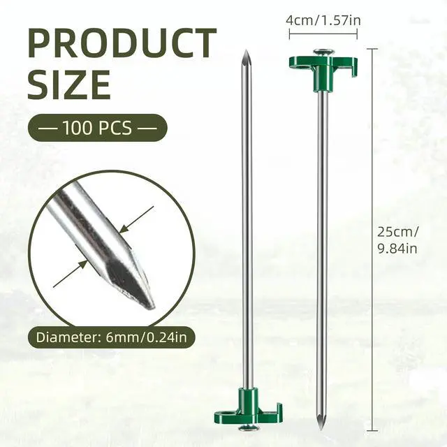 : Material: Premium Steel Metal Color: Silver Function: Fixed Stake Length: 25 cm/ 9.84 in Stake Diameter: 0.6 cm/ 0.24 in Package includes: 100 x 10 Inch Tent Stakes.