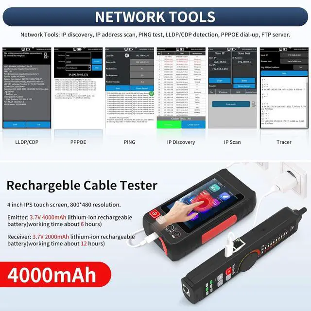 Battery & FTP Server The Ethernet Cable Tester support PD power test and not-contact AC voltage detect. The transmitter has a built-in 3.7V 4000mAh battery and the receiver has a built-in 3.7V 2000mAh battery, providing excellent battery life. The FTP function enables users to copy test reports and data via network FTP. will do our best to resolve any technical support issues as soon as possible.