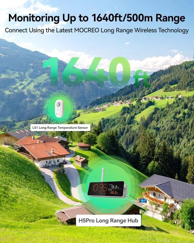 Remote Monitoring: The H5Pro Hub utilizes a long-range wireless protocol to communicate with up to 100 sensors from as far as 1640 ft (1/3 mile) away in open areas. Its digital LCD screen acts as a comprehensive dashboard, displaying real-time readings, historical data charts, alerts, the clock, weather, and a calendar. (Connects via Ethernet or 2.4 GHz Wi-Fi)