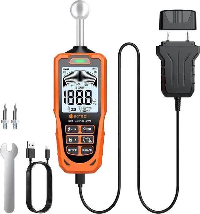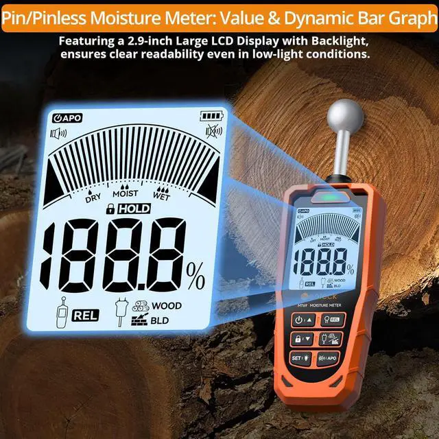 Rechargeable with Utility Function: Moisture reader powered by a 1200mAh battery with USB-C charging for continuous operation. Auto power-off conserves energy after 30 minutes of inactivity. The HOLD function locks readings in vibrating environments, while the backlit LCD ensures clear visibility in dark spaces like attics or crawlspaces