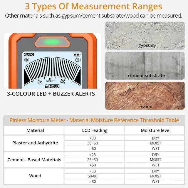 Instant Visual & Audible Alerts: moisture reader delivers clear warnings through color-coded