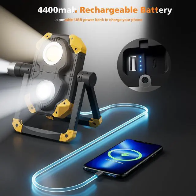 [4400mAh Rechargeable & USB Output] The led work light is equipped with a high-capacity 4400mAh battery, delivering up to 10 hours of runtime. It features an upgraded Type-C port for easier, faster charging, plus a built-in USB-A output to keep your phone, speaker, and other devices powered up.
