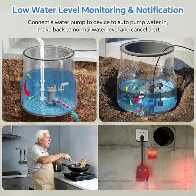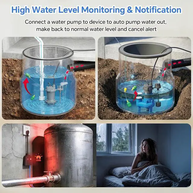 Alarm: The upgraded device emits an alarm sound exceeding 120dB and flashes the LED indicator when it detects a high or low water level alarm, prompt reminders for emergencies. built-in backup battery allows the device to keep working even in a power outage, more flexible installation, and use