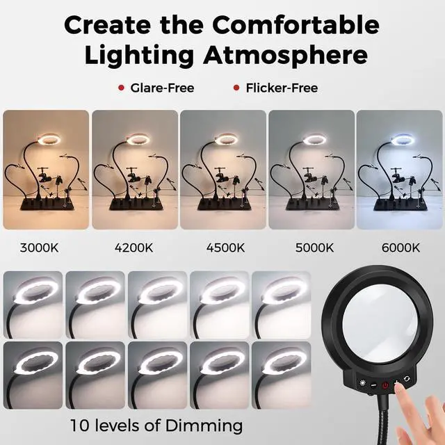 Customizable Light for Precision SolderingAdjust between 50 lighting modes (4500K warm to 6200K cool) for clear, shadow-free visibility. Perfect for soldering PCBs, repairing electronics, or detailed DIY workday or night.