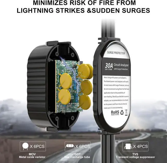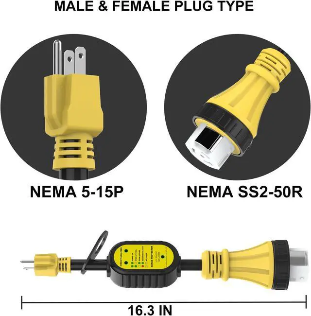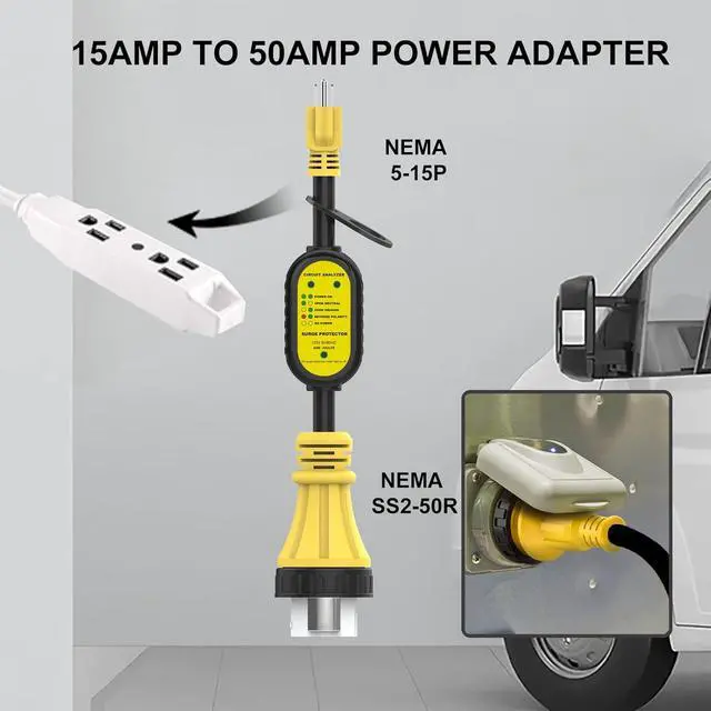 SAFE AND RELIABLE POWER50 amp to 110 adapter rv coming with Increased Receptacle Brass Thickness, the RV Surge Protector can greatly reduce heat. It is worth mentioning that this RV Power Analyzer Adapter is made of Pure PC Material and can withstand high temperatures up to 1382
