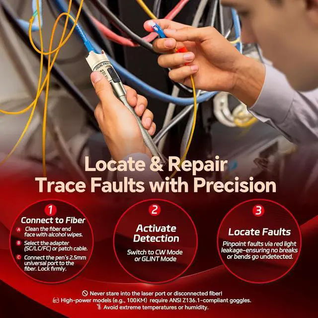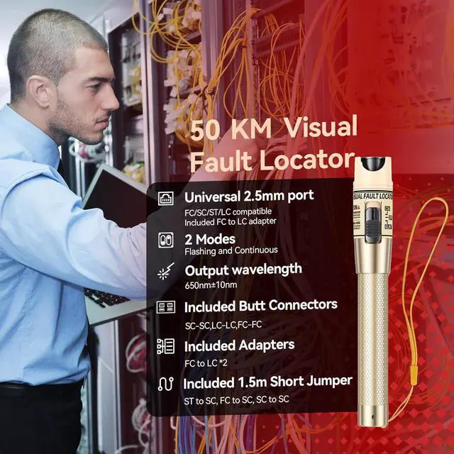FT each): ST to SC, FC to SC, and SC to SC, enabling troubleshooting of fiber optic cables connected to distribution panels without the need to disconnect them.