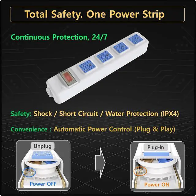 Power Strip: Features 4 outlets, a space-saving flat plug, power cord options in 5ft and 10ft, and 2-prong/3-prong compatibility for flexible placement.