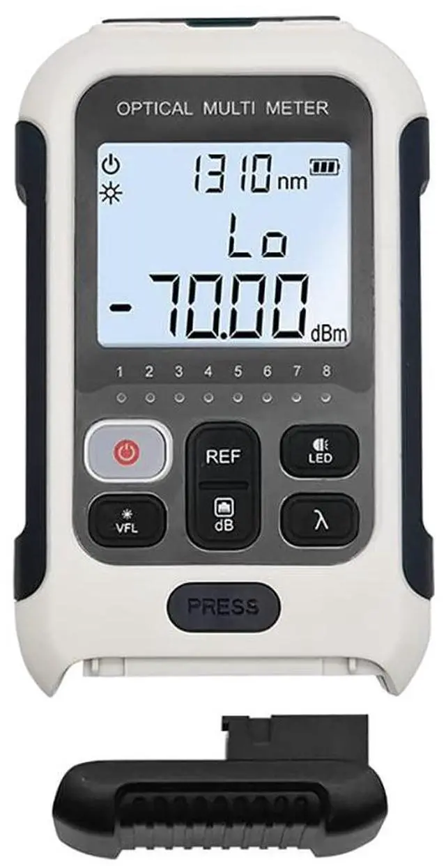 RECHARGEABLE Li-ion BATTERY + AUTO POWER-OFF NO BATTERY REPLACEMENT COST Built-in rechargeable Li-ion battery charges via USB no AA/AAA battery purchases needed in the field. Auto power-off (10 minutes) prevents accidental drain. Backlit LCD display for low-light cabinet and underground vault work. Wavelength memory function retains last-used wavelength setting between power cycles. Compact design with LED flash lighting for work in dark enclosures.