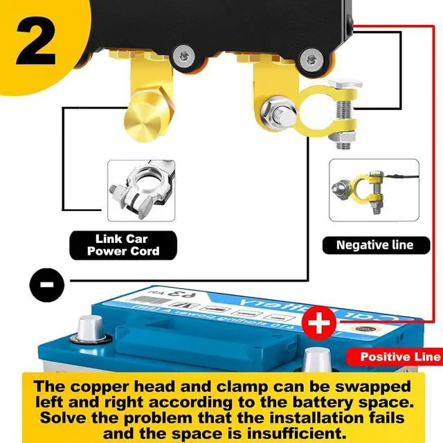 Quick Installation: Mount the copper head and clamp onto your power switch. Remove the negative battery connector. Install the assembled power switch onto the negative battery terminal. After installation, attach the black wire to the negative (-) battery terminal and the red wire to the positive (+) terminal. Verify the unlock button on the remote control successfully powers on the device, and confirm that the lock button effectively shuts it down