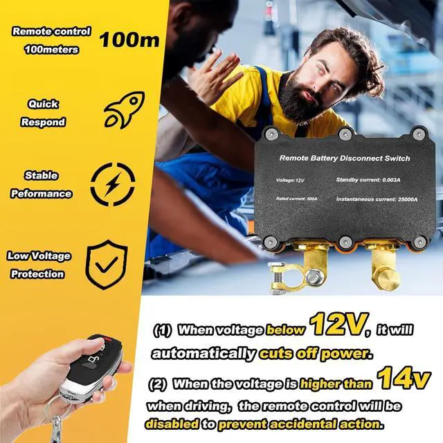 Auto Power Disconnect at 12V: Ensuring safety during parking, this product automatically disconnects power supply when the voltage drops below 12V. To prevent accidental power cuts while on the move, the remote control feature is disabled when the generator generates electricity exceeding 14V. Manual control via the switch becomes the sole option in such situations