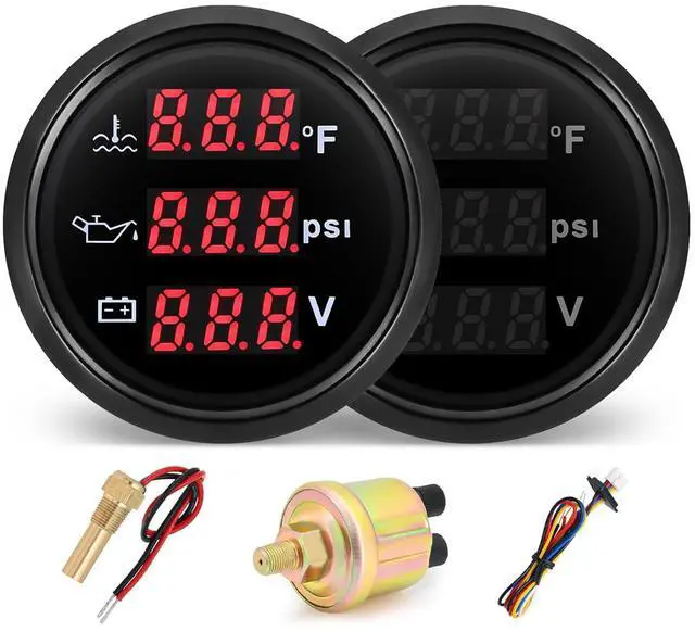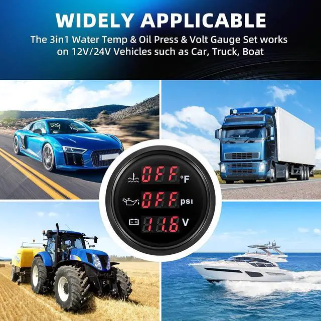 Package Includes: 1x 3-in-1 multifunction gauge, 1x water temp sensor, 1x oil pressure sensor, 1x multi-plug socket, and 1x instruction manual. The package includes all sensors you need