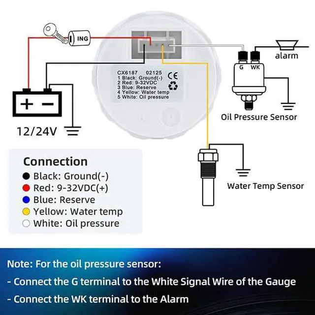 Alarm ValueBoat Gauge with an alarm function: Water temperature > 203°F; Oil pressure < 11.6 PSI; 12V System volt < 11.5V; 24V System volt < 22V. When the values exceed the set thresholds, the corresponding icons will illuminate in red to signal an alert