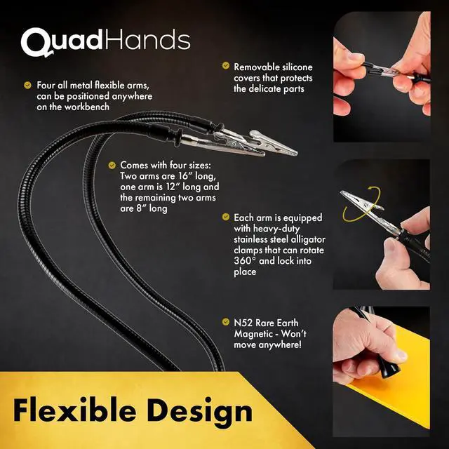 Flexible and Adjustable Arms: Equipped with two 16-inch and two 8-inch arms, featuring flexible metal gooseneck design and stainless steel alligator clips for versatile positioning.