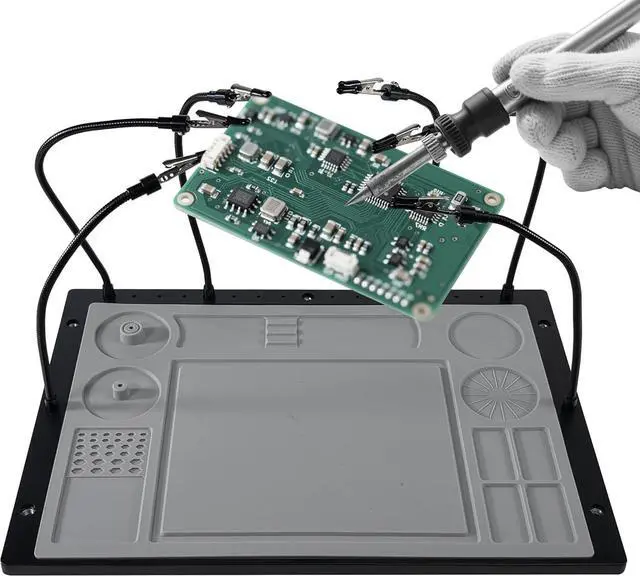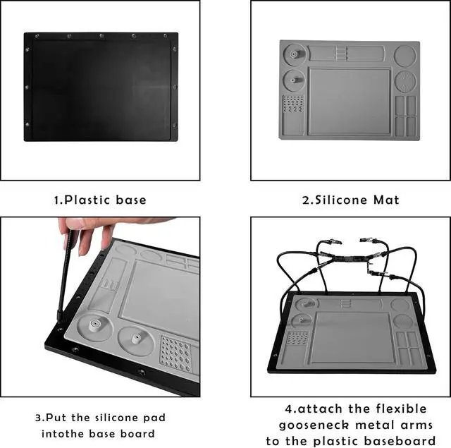 Heavy Duty Base 15.75" x 11" rectangular painted plastic base and 13.97" x 10" silicone mat ensures your large and heavy duty soldering station won't tip over from sliding on the workbench.